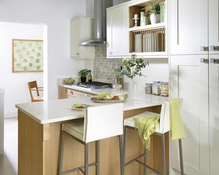 Барная стойка также является неплохим вариантом для людей, которые страдают от нехватки места на кухне. Она компактная и при желании может использоваться не только в качестве обеденной зоны, но и в качестве столешницы. Также при желании можно расширить функциональность данного предмета интерьера – расположить в углу мелкую бытовую технику, сверху добавить навесные шкафчики. Кроме того, в комплекте с барной стойкой иногда идут ящики, полки, рейлинги и ряд других полезных конструкций, которые безусловно не будут лишними на кухне. Если у вас квартира-студия, то данная мебель поможет еще и разделить пространство на зоны, отделяя гостиную от кухни.
