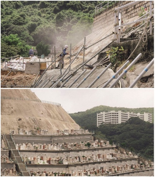 Процесс создания террас для вертикальных некрополей очень сложный и опасный (Гонконг). | Фото: insider.com/ Finbarr Fallon.