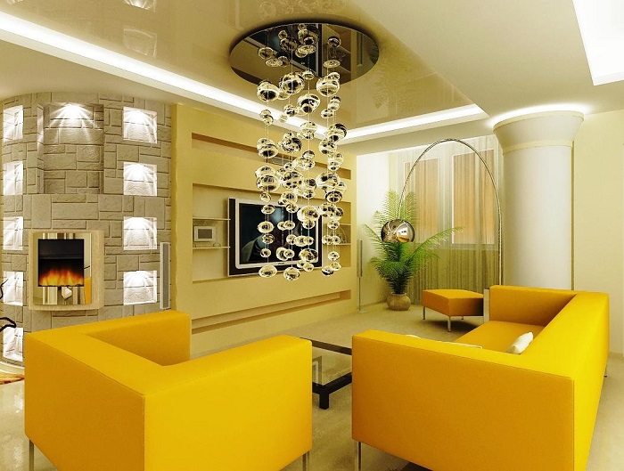 Длинная оригинальная люстра в интерьере гостиной. / Фото: brend-svet.ru
