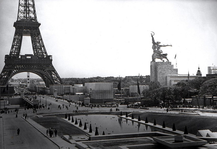 Скульптурную композицию «Рабочий и колхозница» В. Мухина создала для оформления павильона СССР на Всемирной выставке в Париже 1937 г. | Фото: rjadovoj-rus.livejournal.com Нельзя не упомянуть и о грандиозной монументальной группе, без которой сложно представить Москву — это скульптурная группа Веры Мухиной «Рабочий и Колхозница». Именно она одна из первых стала мощным и самым узнаваемым символом столицы, символом Страны Советов и официальной эмблемой киностудии Мосфильм. И снова Париж во время проведения Международной выставки в 1937 г. стал той ступенью, на которой мир впервые увидел советский павильон, устремившийся ввысь благодаря «мощной скульптурной группе».