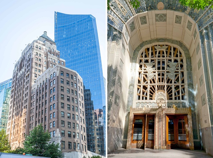 Неординарный объект, расположенный в Бродвейском театральном и коммерческом районе, отличается не только высотой, но помпезной отделкой глянцевой бирюзовой плиткой с темно-синими вкраплениями и декорированный медными панелями. Помимо глубины цвета и оригинального расположения окон, фасад украшают мотивы в виде солнечных лучей, геометрических фигур, зигзагов, шевронов и стилизованных изображений животных и растений.