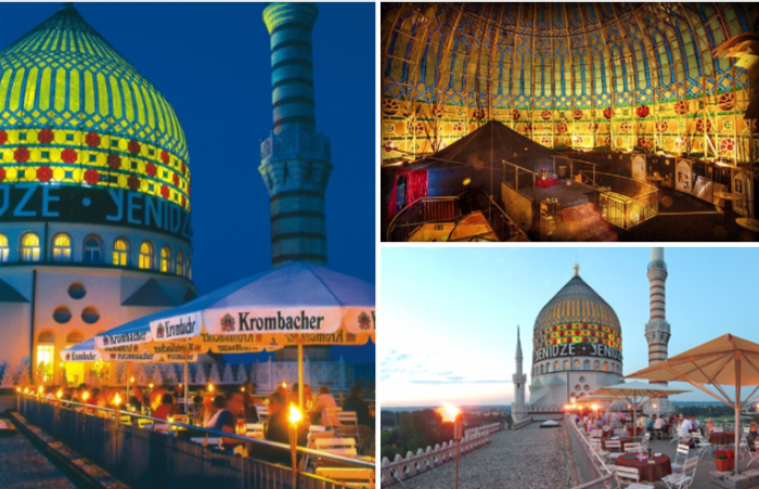Теперь на месте столовой для работников фабрики открыли роскошный ресторан, с террасы которого открывается прекрасный панорамный вид (Yenidze, Дрезден). | Фото: yenidze.eu.