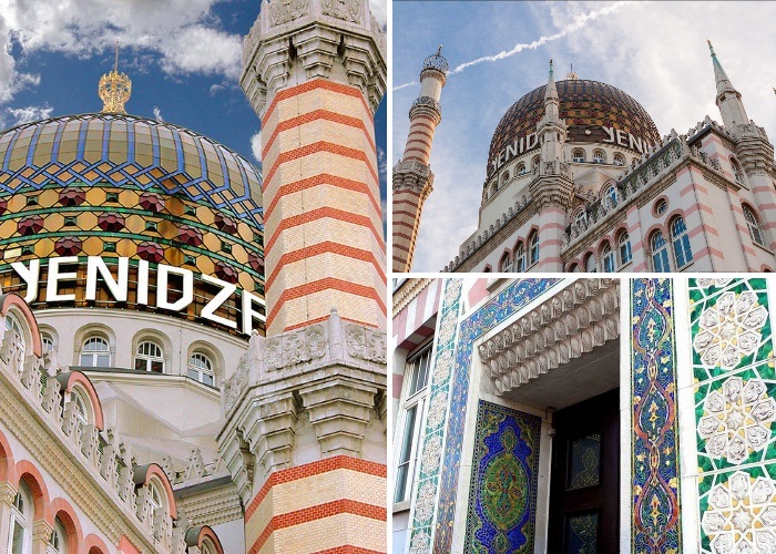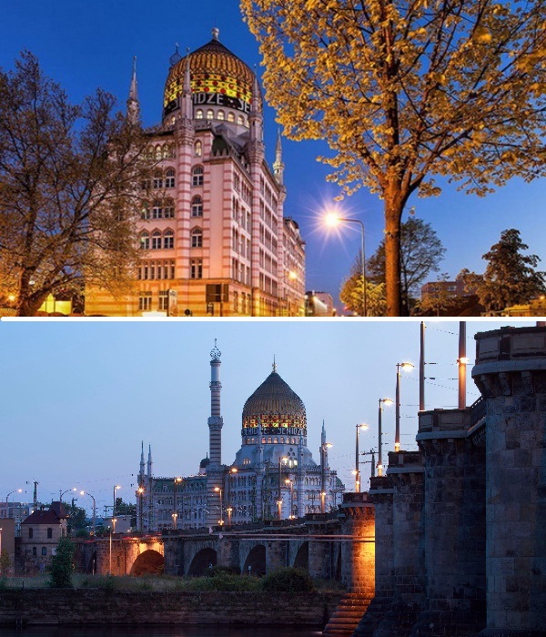 Купол сделали из цветного стекла, что придало особого колорита всему экстравагантному объекту (Yenidze, Дрезден). | Фото: pikabu.ru. Естественно табачный делец решил выкрутиться и выбрать второй вариант развития, благодаря чему архитектура Дрездена пополнилась необычным объектом, который вызвал бурю возмущения и протестов. Но это ничуть не смущало табачного магната, а совсем наоборот, привлекало еще больше внимания, а вот архитектор, к которому он обратился, был исключен из гильдии архитекторов Германии.