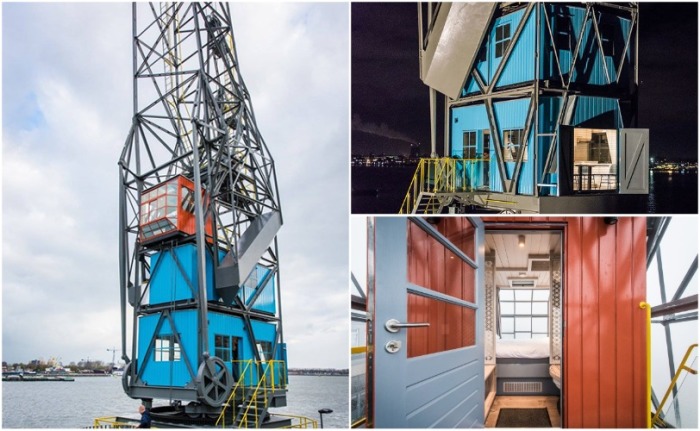 После реконструкции списанный башенный кран был снова установлен в порту (Амстердам, Yays Crane Apartment). | Фото: servicedapartmentnews.com.