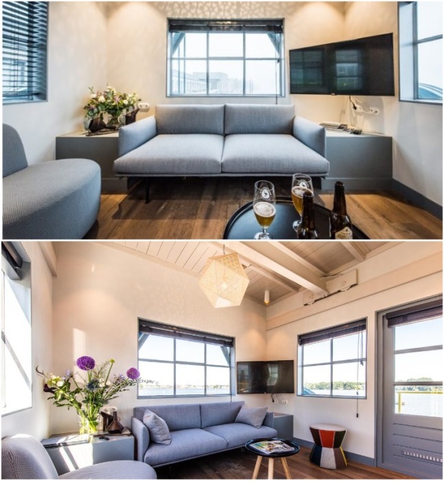 На первом этаже расположена уютная гостиная с мультимедийной системой (Yays Crane Apartment, Амстердам). | Фото: techcult.ru.