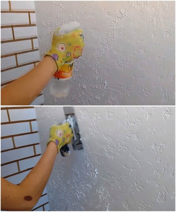 Декоративную штукатурку на стену наносят с помощью штапеля и затирки, которой и разравнивают поверхность. | Фото: youtube.com/ Анастасия Зайцева.