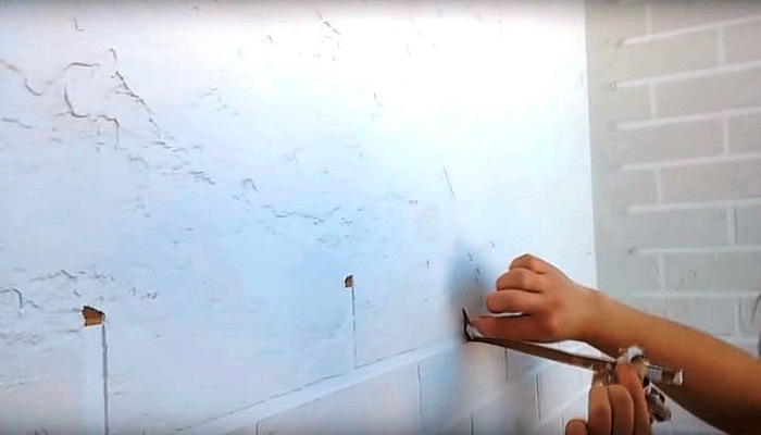 Когда стену или ее часть вы заштукатурили нужно дать несколько минут на то, чтобы состав схватился, а потом начинать аккуратно удалять наклеенную изначально малярную ленту. На этом этапе нужно обязательно учитывать время застывания материала, которое, как правило, указывают на этикетке. Нельзя затягивать этот процесс, потому что можно повредить вновь созданные «кирпичи».