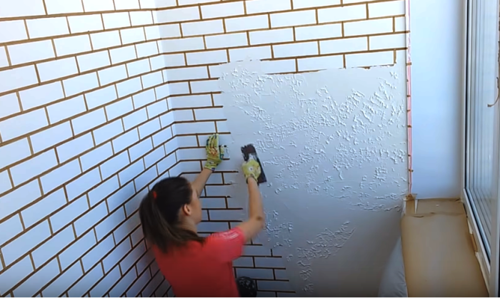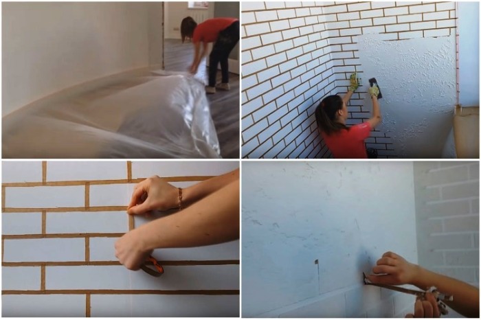 Многие мечтают сделать в своей квартире стену в стиле лофт с кирпичной кладкой. Но поход в магазин стройматериалов заставляет забыть о столь желанном интерьере, ведь далеко не все смогут обнаружить под слоем штукатурки настоящий кирпич, а на покупку такого материала потребуется кругленькая сумма. Хотя как показывает практика, и в этом случае не надо отчаиваться, потому что всегда найдутся умельцы, которые с минимальным бюджетом смогут сделать идеальную кладку .без кирпича. При этом они не только изобретают и ухищряются, но и делятся своим опытом в Сети. Кирпичную стену можно сделать из декоративной штукатурки (работа Анастасии Зайцевой). | Фото: pro-remont.mediasalt.ru. Кирпичная стена в интерьере квартиры или дома стала очень модным атрибутом и многие стремятся заполучить ее любой ценой. Конечно же, есть некоторые счастливчики, которые смогут обнаружить под толстым слоем штукатурки столь желанный материал. Им останется его только очистить, привести в порядок, покрасить и стильный элемент декора интерьера готов. Но, как правило, большинство из нас под ней обнаруживает бетон, алебастр, строительный мусор, а иногда и дыры к соседям (кому совсем не повезет). Поход в магазин стройматериалов у многих сразу отбивает охоту от создания стильного элемента интерьера, потому что цена на настоящий кирпич очень уж кусается, даже если кладкой планируют заниматься сами. Но наш народ на выдумку всегда хитер, поэтому нашлись мастера, которые с минимальными затратами умудряются создавать настоящие шедевры, не заменяя натуральный материал на банальные обои под кирпич или такого же плана декоративные плиты из пенопласта. Сделать декоративную штукатурку под кирпич смогут даже дилетанты или хрупкие девушки. | Фото: youtube.com/ Анастасия Зайцева. И самое интересное, за такую грязную работу берутся хрупкие девушки, которым удается создавать настоящие шедевры. Так, например, мастер декоративной штукатурки Анастасия Зайцева на своем канале в You Tube показала довольно интересный способ создания кирпичной стены без кирпича. Благодаря ее методу можно без особых капиталовложений наконец-то исполнить свою мечту, но для этого все равно понадобится ваше желание, сноровка, некоторые стройматериалы и инструмент. Чтобы облегчить вам задачу на примере идеи Насти, авторы Novate.Ru составили наглядную инструкцию как это сделать качественно и красиво. Для создания кирпичной стены без кирпича нужно иметь декоративную штукатурку, грунтовку, воду и инструмент. | Фото: youtube.com/ Анастасия Зайцева. Итак, для того чтобы сделать практически настоящие «кирпичи» собственными руками,Э понадобится: - полиэтиленовая пленка для защиты напольного покрытия от влаги и раствора; - глубоко проникающая грунтовка для подготовки стен; - лазерный уровень; - узкая малярная лента (изолента); - декоративная акриловая штукатурка для внутренних работ; - металлическая затирочная доска; - шпатель; - пульверизатор; - наждачная бумага; - валик; - вода. Чтобы не испортить напольное покрытие его нужно затянуть защитной пленкой. | Фото: youtube.com/ Анастасия Зайцева. Прежде чем приступать к работе, нужно освободить стену и подступы к ней. Чтобы не повредить напольное покрытие, накройте его защитной пленкой и зафиксируйте ее максимально близко к плинтусам. Очистите плоскость от пыли, если есть трещины или отслойки штукатур