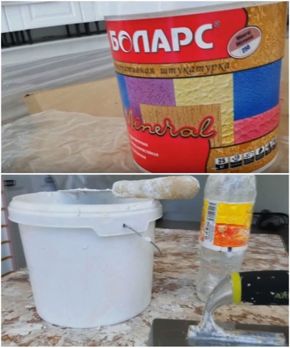 - полиэтиленовая пленка для защиты напольного покрытия от влаги и раствора; - глубоко проникающая грунтовка для подготовки стен; - лазерный уровень; - узкая малярная лента (изолента); - декоративная акриловая штукатурка для внутренних работ; - металлическая затирочная доска; - шпатель; - пульверизатор; - наждачная бумага; - валик; - вода.