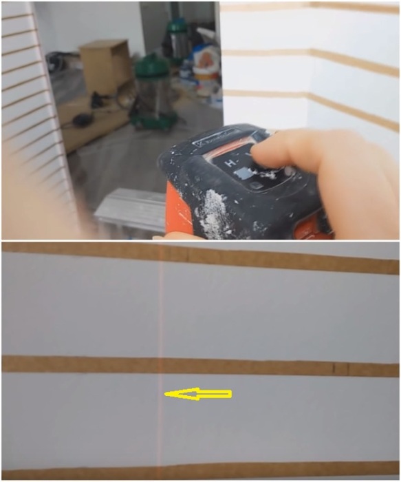 Для нанесения разметки на стену понадобится лазерный уровень. | Фото: youtube.com/ Анастасия Зайцева.