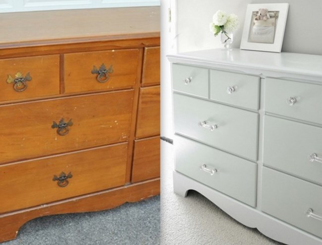 Например, с потрепанного комода нужно будет снять облупившуюся краску при помощи специального растворителя, затем отполировать наждачной бумагой и покрасить в желаемый цвет. Последний пункт будет зависеть от вашего интерьера: если он выполнен в нейтральных оттенках, например, белом или сером, то предмет мебели лучше покрыть яркой краской, чтобы он стал своеобразным акцентом. Если же отделка и текстиль темные, то выигрышнее будет смотреться комод светлого оттенка. Также вы можете повесить на него новую фурнитуру, заменить ручки. Если вы или кто-то из ваших родственников, друзей хорошо рисует, то мебель можно еще и расписать. Тогда вы точно получите уникальный предмет интерьера, которого больше ни у кого не будет.