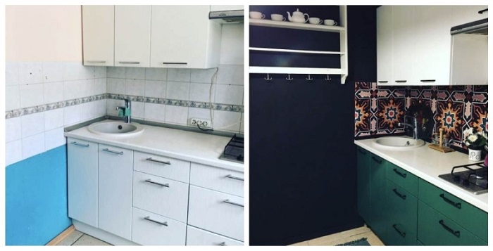 Кухня до и после покраски гарнитура, стен и смены фартука. / Фото: kakpostroit.su