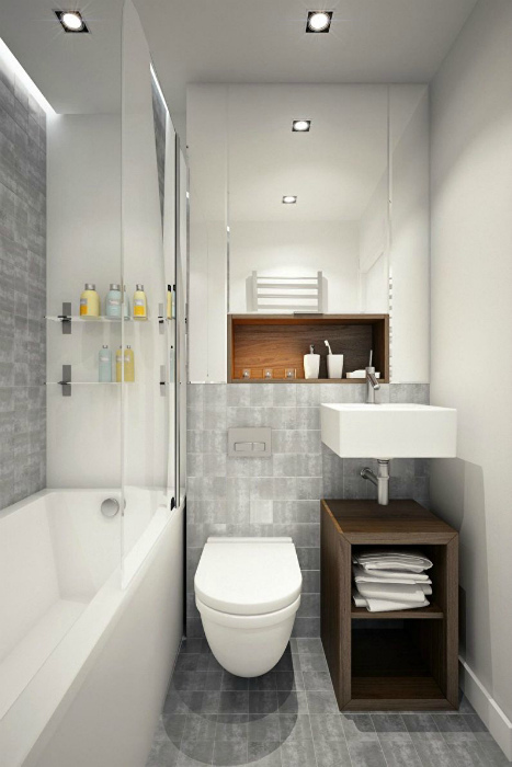 Санузел в современном стиле. | Фото: Legko.com. Маленький смежный санузел в серо-белых тонах, с ванной за стеклянной «шторкой», открытой деревянной тумбой для полотенец, встроенной полкой и современной навесной сантехникой.