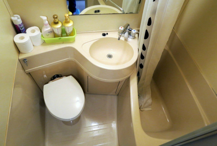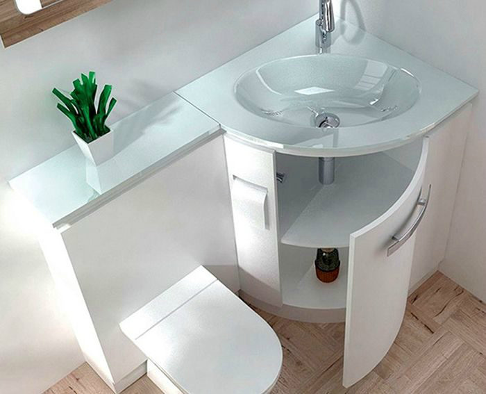 Встроенная сантехника. | Фото: Combo.bg. Раковина и унитаз, встроенные в шкафчик весьма необычной формы, - отличное решение для маленького смежного санузла.