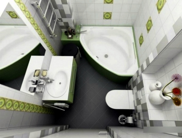 Санузел с угловой ванной. | Фото: GreatHomee. Маленький санузел, оформленный в светлых тонах с приятными глазу зелеными акцентами, ключевой деталью которого стала оригинальная угловая ванна.
