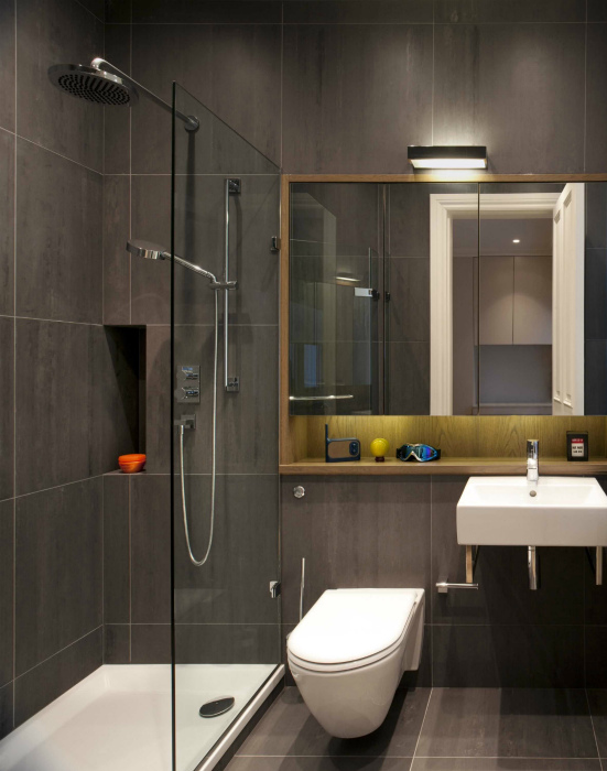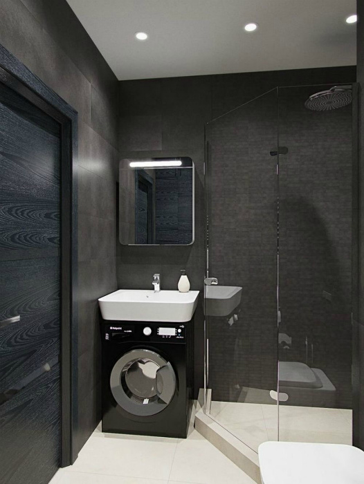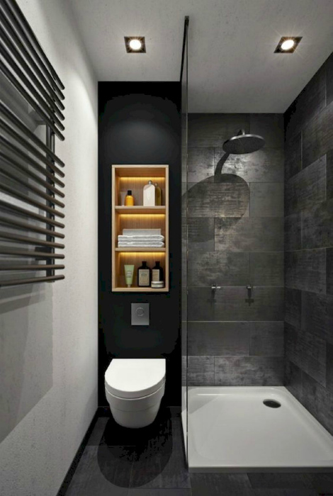 Маленький санузел в темных тонах. | Фото: Мужской клуб. Владельцы маленьких помещений обычно избегают темных цветов и зря, ведь при грамотном использовании с их помощью можно добиться колоссальных результатов. Яркий тому пример - этот маленький смежный санузел, оформленный в оттенках мокрого асфальта. Присмотритесь, именно благодаря цвету отделки и правильному освещению удалось полностью стереть границы стен.