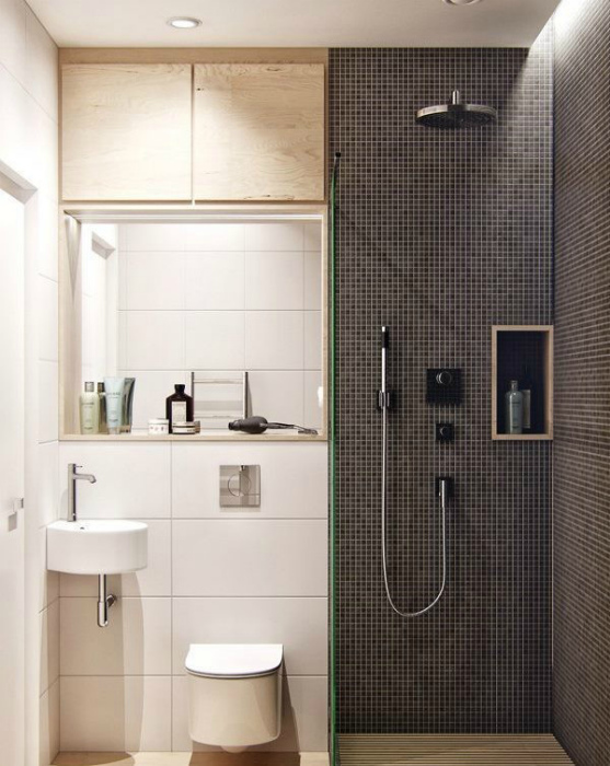 Интересные решения для маленьких ванных комнат. Реальность такова, что у большинства наших соотечественников размеры ванных комнат оставляют желать лучшего. Казалось бы, о каком стиле и дизайне может идти речь, если в такое крохотное пространство с трудом умещается только самое необходимое. Мы же собрали 16 актуальных решений, которые стоит взять на заметку владельцам маленьких санузлов. 1. Темнее ночи Маленький санузел в темных тонах. | Фото: Мужской клуб. Владельцы маленьких помещений обычно избегают темных цветов и зря, ведь при грамотном использовании с их помощью можно добиться колоссальных результатов. Яркий тому пример - этот маленький смежный санузел, оформленный в оттенках мокрого асфальта. Присмотритесь, именно благодаря цвету отделки и правильному освещению удалось полностью стереть границы стен. 2. Многослойность Многослойный интерьер ванны. | Фото: Dritare.net. Чтобы решить проблему нехватки места, в этой маленькой ванне удалось при помощи необычного размещения сантехники, а именно маленькой раковины, установленной прямо над ванной необычной формы. 3. Совместное решение Встроенная сантехника. | Фото: Combo.bg. Раковина и унитаз, встроенные в шкафчик весьма необычной формы, - отличное решение для маленького смежного санузла. 4. Стерильность Крошечный санузел, выложенный белой плиткой. | Фото: Pinterest. Смежный санузел очень скромных размеров, выложенный мелкой белоснежной плиткой, с душевой кабинкой, отделенной от общего пространства шторкой и обилием разнообразных деталей из дерева. 5. Теплый шоколад Элегантный санузел в коричневых тонах. | Фото: Houzz. Классический смежный санузел, оформленный в элегантных коричневых тонах, где вся сантехника установлена вдоль одной стены, а изюминкой стал встроенный шкафчик с зеркалом и желтой подсветкой. 6. Перегородка Светлый санузел с душевой кабиной. | Фото: acemesh.me. Смежный санузел с крупной белой плиткой на полу и на стенах, оригинальной полкой под умывальник, элегантными светильниками и душевой кабинкой, отделенной от общего пространства стеной-перегородкой. 7. Эргономичность Эргономичные решения для очень маленького санузла. | Фото: Pinterest. По мнению Novate.ru, этот санузел - настоящий кладезь эргономичных решений, которые стоит взять на заметку всем владельцам маленьких пространств. Тут стиральная машинка выполняет роль тумбочки под раковину, вместо шкафчика имеется аскетичная деревянная полка. 8. Обтекаемые формы Плавные линии в дизайне санузла. | Фото: Строим дома и коттеджи. Это крошечный смежный санузел - настоящий образец плавных линий и обтекаемых форм. Именно благодаря этому в нем удалось уместить все необходимое. 9. Строгие линии Порядок и строгие линии. | Фото: stroisovet.com. Небольшой санузел, оформленный в нейтральных серых тонах, с квадратной душевой кабинкой, стеклянными полками и накладной раковиной и простым унитазом. 10. Модное решение Санузел в современном стиле. | Фото: Legko.com. Маленький смежный санузел в серо-белых тонах, с ванной за стеклянной «шторкой», открытой деревянной тумбой для полотенец, встроенной полкой и современной навесной сантехникой. 11. Угловые шкафчики Заполнение угла. | Фото: Pinterest. По мнению Novate.ru, владельцы маленьких санузлов не могут себе позволить оставлять углы пустые. Сделать эти участки функциональными поможет угловая мебель и сантехника. 12. Нестандартные фо