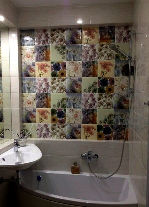 Многослойный интерьер ванны. | Фото: Dritare.net. Чтобы решить проблему нехватки места, в этой маленькой ванне удалось при помощи необычного размещения сантехники, а именно маленькой раковины, установленной прямо над ванной необычной формы.