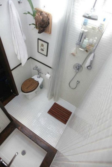 Крошечный санузел, выложенный белой плиткой. | Фото: Pinterest. Смежный санузел очень скромных размеров, выложенный мелкой белоснежной плиткой, с душевой кабинкой, отделенной от общего пространства шторкой и обилием разнообразных деталей из дерева.