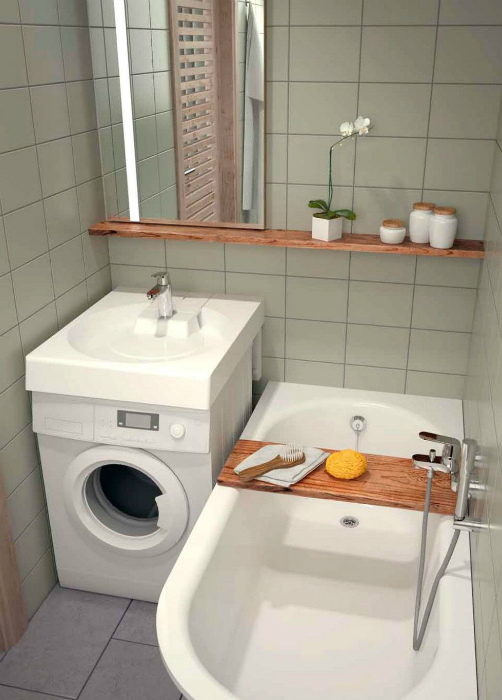 Эргономичные решения для очень маленького санузла. | Фото: Pinterest. По мнению Novate.ru, этот санузел - настоящий кладезь эргономичных решений, которые стоит взять на заметку всем владельцам маленьких пространств. Тут стиральная машинка выполняет роль тумбочки под раковину, вместо шкафчика имеется аскетичная деревянная полка.