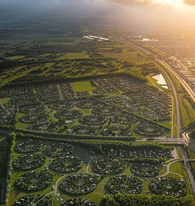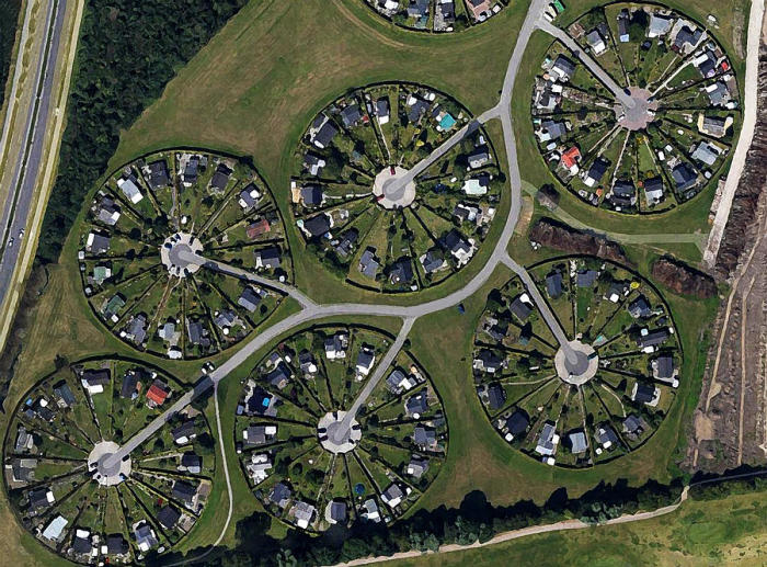 Каждый круг разделен на 16 равноценных участков-секторов (Брондбю, Дания). | Фото: twitter.com/ Henry_Do. Примечание: Br?ndby Garden City поделен на несколько больших кругов, внутри которых расположено 16 домов с участками-секторами, похожими на кусочек торта.
