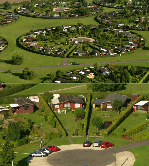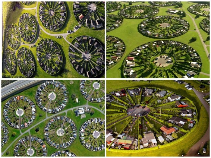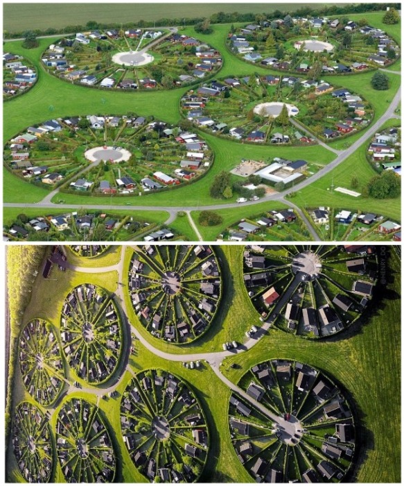 В центре каждого необычного квартала вместо колодцев организовали парковку (Brоndby, Дания). | Фото: news.myseldon.com. Как объяснил автор проекта, такая планировка «символизирует старую деревню, где люди встречаются у колодца в центре». Естественно, вместо колодца в центре каждого круга организована внутренняя парковка, но таким образом стремление «повысить социальное взаимодействие между теми, кто арендует садовые участки» все равно было реализовано.