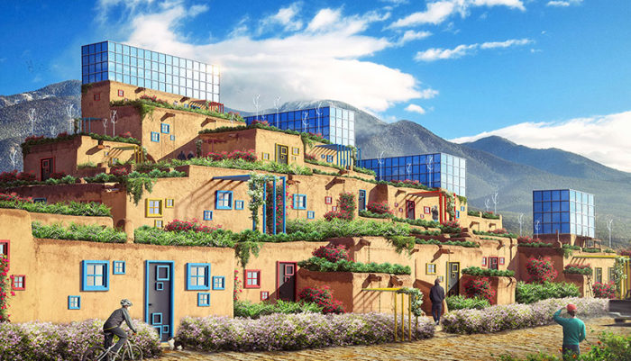 Чтобы исправить все огрехи в проектировании и строительстве, графические дизайнеры посчитали целесообразным добавить стеклянные надстройки с вмонтированными фотоэлементами, которые выполняли бы роль комнат общего пользования, а солнечные батареи смогли бы обеспечивать полную энергонезависимость всему поселению. Очень интересно задействовали свободные площадки перед каждым отодвинутым внутрь этажом. На них они решили создать зеленые зоны для отдыха и игр детей. Таким образом, обновленный пуэбло сохранил привычный образ, но стал более красивым и комфортным.