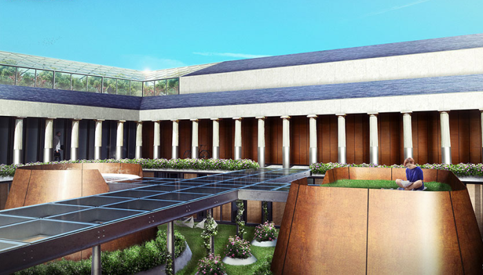 Учитывая, что эта визуализация современное видение, то и статусные рамки были стерты. Полностью обновленный Сихэюань имеет новые колонны и стильный фасад. А вот крышу решили оставить оригинальную, лишь сменив цвет и установив на ней солнечные батареи, которые сделают особняк энергонезависимым. Обновили и внутренний двор, где оборудовали площадки для медитации, отдыха и игры.