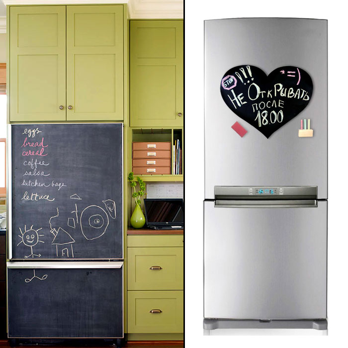 С помощью меловой доски холодильник превратится в настоящий центр домашних сообщений. Можно заказать готовую доску в размер и заменить ею на холодильнике старые панели из нержавейки. А можно сделать такое место для записей самостоятельно, покрасив деревянные панели баллончиком. Третий вариант - приобрести небольшую доску, которую можно прикрепить на холодильник с помощью магнитной поверхности на обороте.