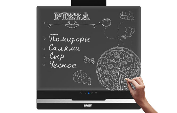 Те, кто пытался замаскировать или хотя бы органично вписать вытяжку в интерьер кухни, знают, насколько это непросто. А тем временем без вытяжки на кухне обойтись невозможно. Меловая доска у вытяжки KRONA позволяет спрятать громоздкую конструкцию за весьма функциональным и привлекательным фасадом. Сенсорное управление также находится на лицевой панели.