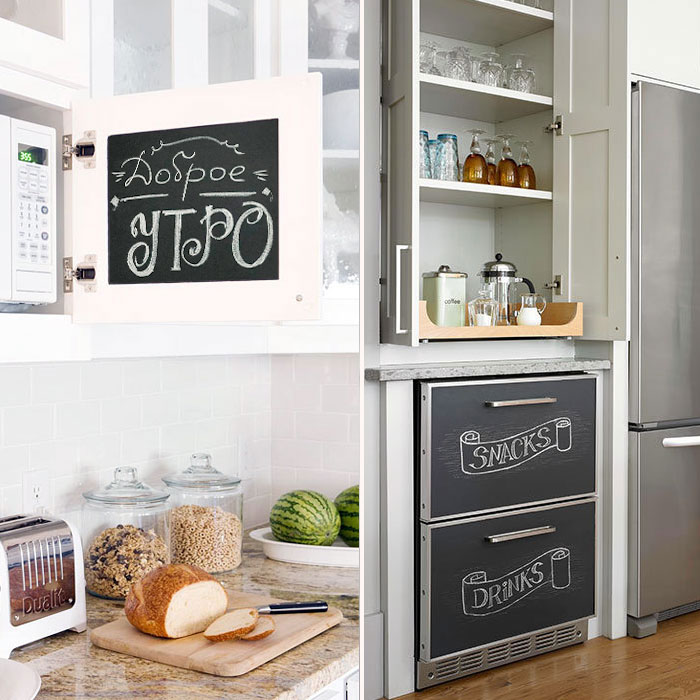 Кухонные шкафчики могут стать идеальным местом для разного рода записей: домашнего расписания, списков продуктов, напоминаний и заметок. А ещё таким образом можно маркировать кухонные ящики – теперь точно не ошибёшься и не забудешь где и что лежит.