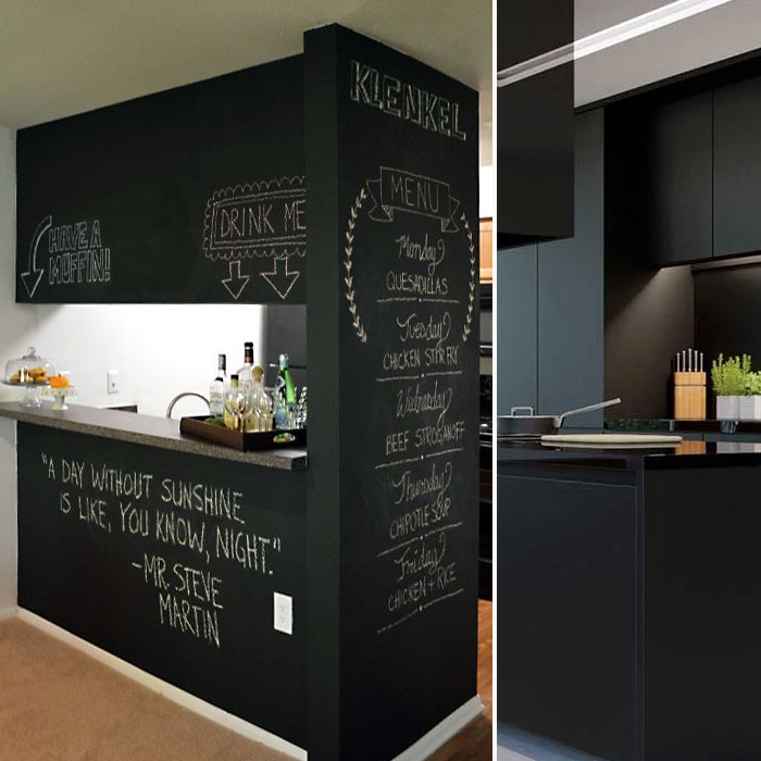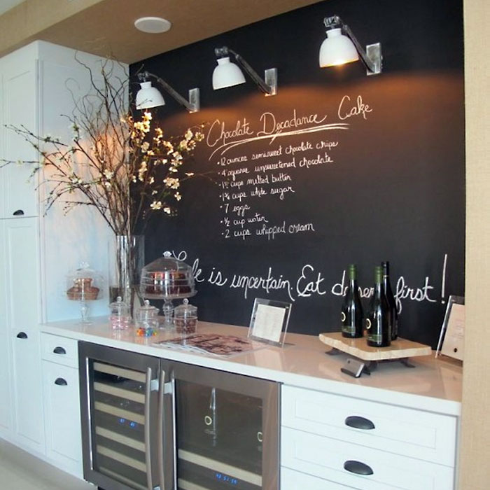 Кухня черного цвета превращается в одну большую поверхность для записей. Эта идея подойдёт самым смелым – тем, кто отважиться сделать кухню чёрной. Достаточно правильно обработать поверхность кухонной мебели, чтобы мел оставлял следы, и писать можно практически в любом месте и всё, что угодно: романтические послания, шутки, вдохновляющие цитаты и напоминания о важных делах и встречах. Главное – не запутаться и не растеряться в таком ворохе информации.