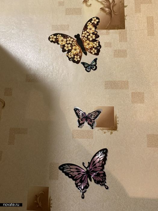 Самым трендовым решением в настенном дизайне вот уже несколько лет являются бабочки. Они могут быть какими угодно: вырезанными из бумаги и согнутыми по центру объёмными бабочками, слетевшимися в стаю, три-дэ наклейками, наклейками одномерными - тут полет фантазии воистину бесконечен. Для ого, чтобы никто не догдался, что вы маскируете точечное повреждение обоев, бабочек, конечно же, должно быть несколько (как минимум три).