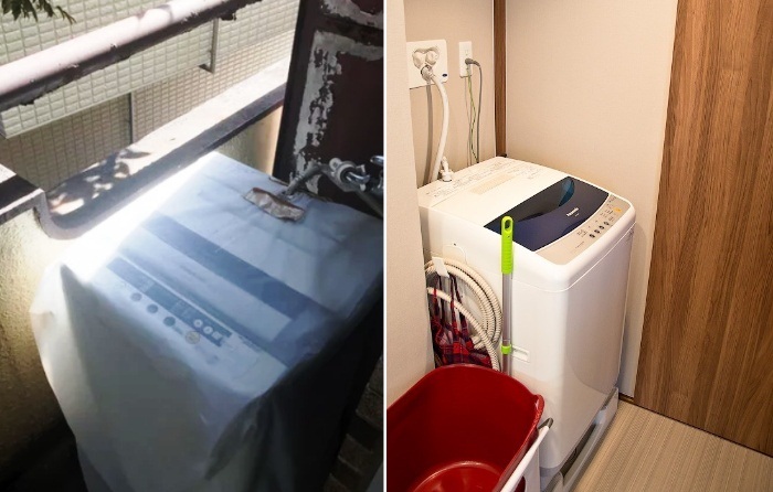 Самой большой проблемой является установка машинки, которая никак не помещается в крошечной ванной, тем более если она мокрая, то ставить ее туда все равно нельзя. Столь незаменимую помощницу пристраивают, кто куда может. Кстати сказать, в Японии балконы в малогабаритных квартирах совсем крошечных размеров и не застеклены.