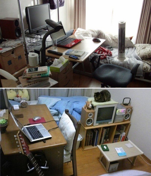 Если же и на нее нет денег, то устанавливают кровать, диван или просто раскладывают матрас (традиционный японский футон) на полу, но тогда места для передвижения совсем не остается.