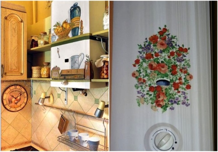 Не всегда есть возможность поменять мебель или сделать короб для того, чтобы спрятать газовое оборудование, поэтому изобретательно-творческий народ придумал массу способов, чтобы и «дешево и сердито» желательно еще и быстро. В этом случае особых советов и правил нет, если, конечно же, фантазийные задумки не идут в разрез основным требованиям и нормам и никак не повлияют на безопасность самого дизайнера и на окружающих. Следующие примеры наглядно покажут, что можно сделать, если созерцать не завуалированные газовые аппараты и коммуникации, идущие к ним, совсем уж надоело.