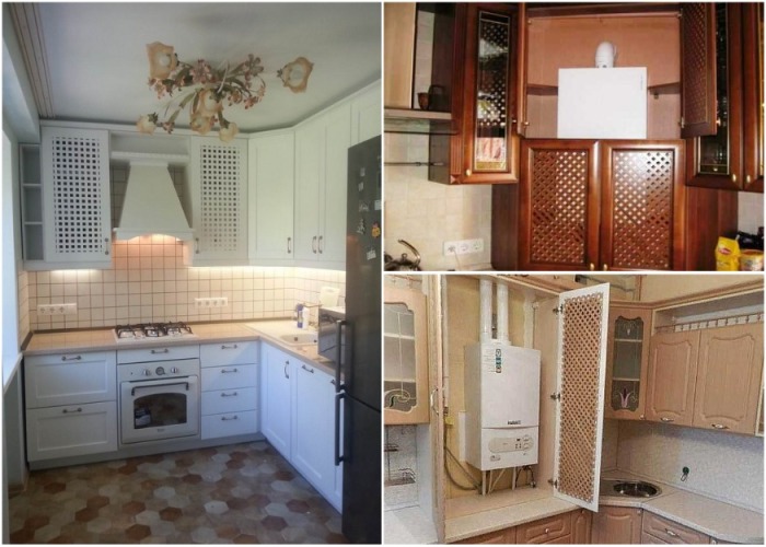 Наилучшим во всех отношениях вариантом станет решетчатая или ажурная дверь шкафа. Если же газовый котел находится в том месте, где нет кухонного гарнитура, то для него своими руками можно соорудить маскировочный короб, при этом, не забывая про основные правила монтажа и безопасного эксплуатирования.