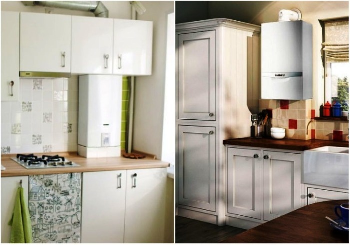 Если вы счастливый обладатель квартиры в новострое и с нуля организовываете свой быт, или же решили устанавливать котел/колонку во время кардинальной смены интерьера, то газовое оборудование можно сделать элементом гарнитура. Но к такой маскировке надо тщательно подготовиться и заранее знать, где оно будет находиться. Естественно, размер и цвет навесных или напольных шкафов всецело будет подчиняться габаритам, форме и цветовой гамме устанавливаемого агрегата.