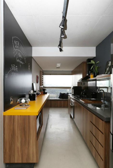 Узкая, но яркая кухня. | Фото: Pinterest. Потрясающий дизайн узкой кухни, где нет громоздкой мебели, но есть две рабочие зоны, расположенные параллельно друг другу и маленький диванчик у окна.
