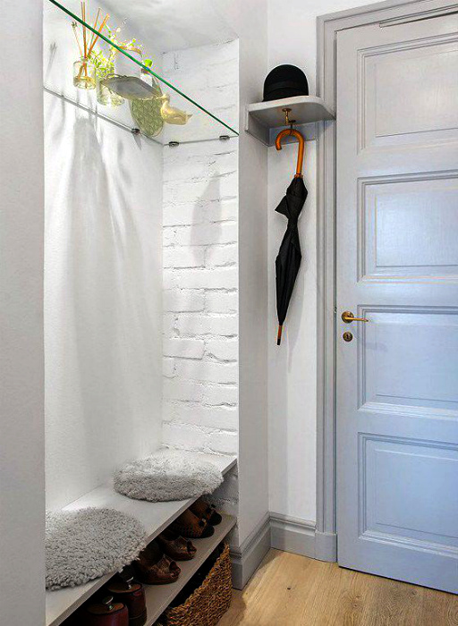 Ниша в прихожей. | Фото: 24sata. Светлая маленькая прихожая с нишей, в которой удалось разместить несколько полок: для обуви, для сидения, для головных уборов и предметов декора.