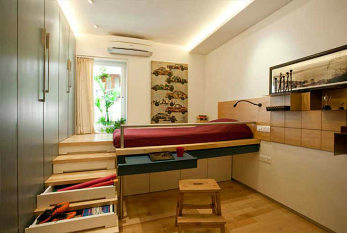 Функциональная кровать на подиуме. | Фото: Любопытный мир. Кровать на высоком подиуме, в котором нашлось место для выдвижного столика, а в ступенях к нему удалось разместить выдвижные шкафчики - яркий пример того, как с помощью одной конструкции решить вопрос тотальной нехватки свободного пространства.
