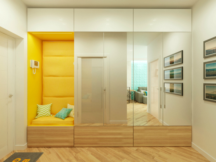 Яркая ниша с диванчиком. | Фото: Ежедневный журнал. Прихожая со встроенным зеркальным шкафом и узкой нишей с мягкой желтой обивкой и компактным диванчиком.