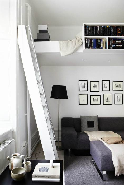 Гостиная и спальня в одном пространстве. | Фото: jessegannontruth.com. Изумительное пространство в стиле минимализм, оформленное в черно-белых тонах со спальным местом, расположенным над зоной гостиной.