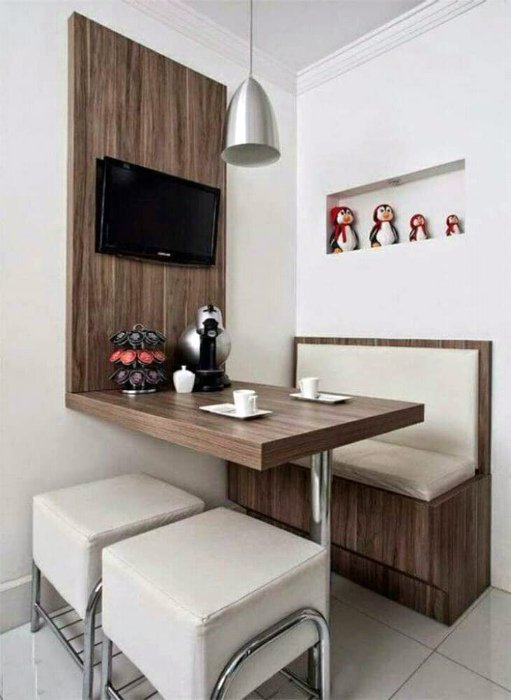 Зона отдыха на кухне. | Фото: timbrit. Пример стильного и лаконичного оформления зоны отдыха на кухне с оригинальным столом, плавно перетекающим в ТВ-зону, компактным диванчиком и двумя мягким табуретами.