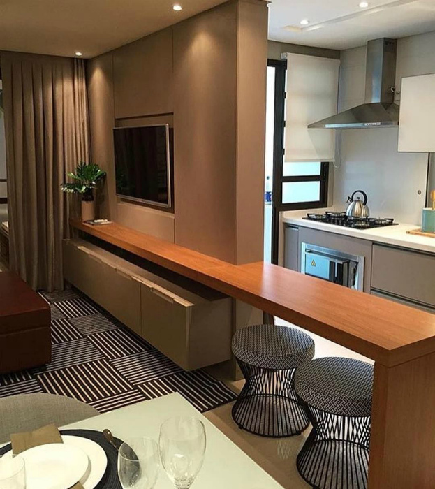 Разделительная барная стойка. | Фото: Pinterest. Небольшая квартира открытого типа с барной стойкой из дерева, которая одновременно выполняет функции стола и разделяет две жилые зоны.
