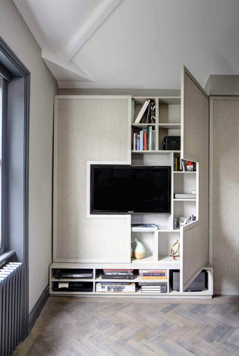 Шкаф с телевизором. | Фото: Lakbermagazin. Обычно для телевизора нужно покупать полку и освобождать целую стену. Однако, по мнению Novate.ru, в условиях маленького пространства это просто не рационально. То ли дело этот вместительный шкаф с двумя секциями и отдельным местом под ТВ.