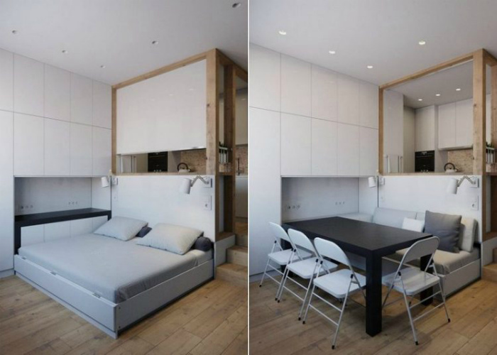 Трансформирующаяся мебель. | Фото: fancyhouse.co. Фантастическая мебельная стенка, которая в зависимости от потребностей может превращаться в большой обеденный стол или в двуспальную кровать с тумбой. Если же ни в том, ни в другом нет необходимости данный комплект мебели может складываться в обычный шкаф.