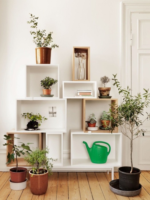 Растения будут отлично смотреться на открытом стеллаже в комплекте с книгами и вазами. / Фото: Interiorsmall.ru