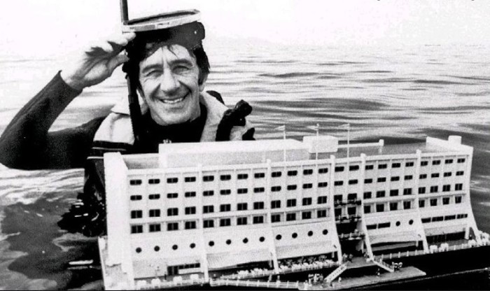 Даг Тарка и плавучая модель отеля, которую он спроектировал вместе с компанией Consafe-Sweden. | Фото: disgustingmen.com.