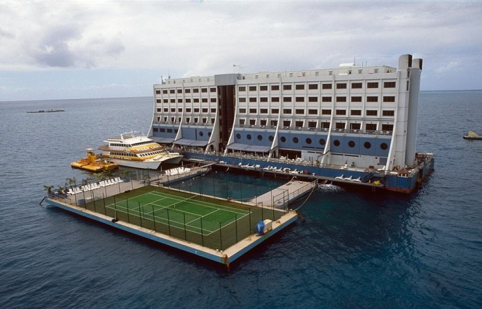 Строительство плавучего отеля обошлось в 27 млн. дол. США. | Фото: disgustingmen.com. Волею судьбы такая транспортировка стала огромным ударом по самим кораллам, ведь плавучее сооружение не смогло пройти в лагуну Квинсленда, поэтому риф Джона Брюера очень сильно пострадал. Это событие было первым звоночком о непростой судьбе созданного отеля, ведь он был призван создавать идеальные условия для любования природными красотами, а не стать причиной их полного уничтожения.